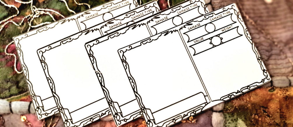 Print and cut these weapon cards to help keep track of your weapons! As a GM, you can customize these cards to hand out to your players, making for a quick way to distribute magical items!